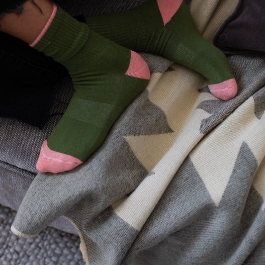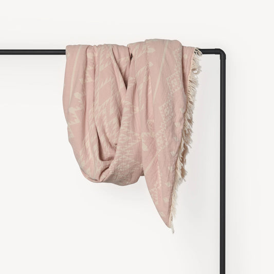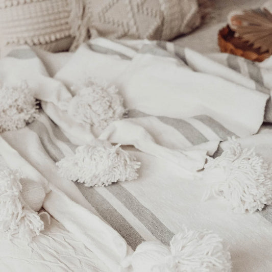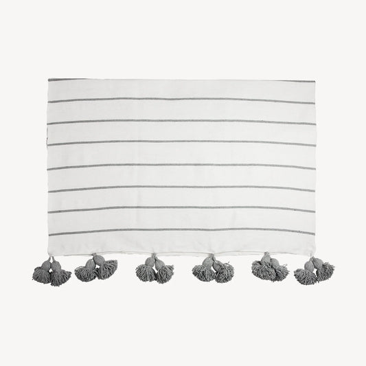 Monochrome Striped Moroccan Pom Pom Blanket - Light Grey