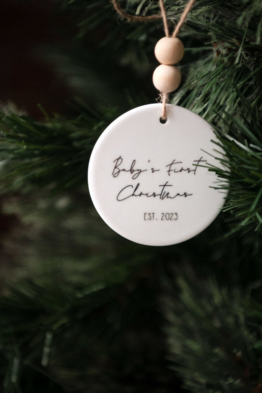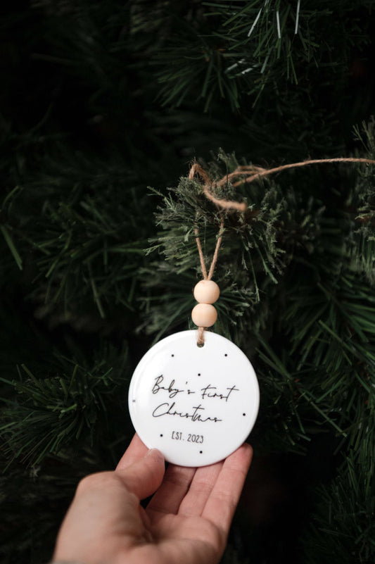 Baby's First Christmas Ceramic Ornament with Wood Beads