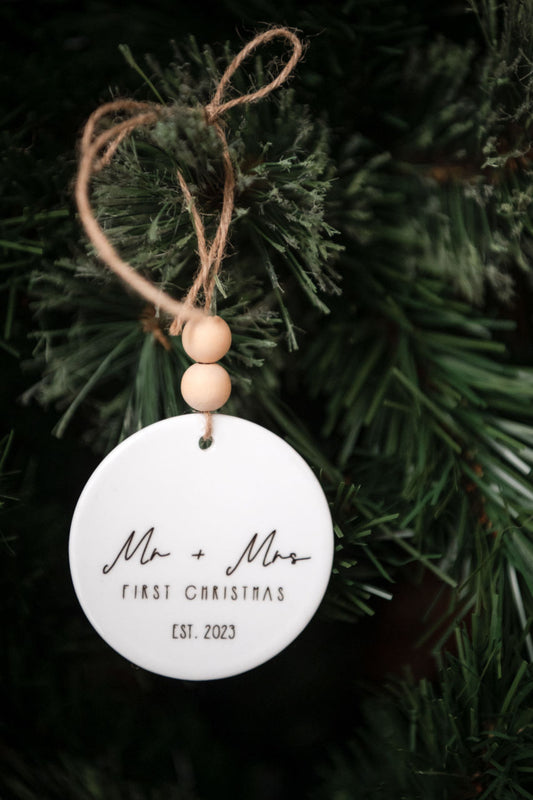 Mr & Mrs First Christmas Ceramic Ornament with Wood Beads