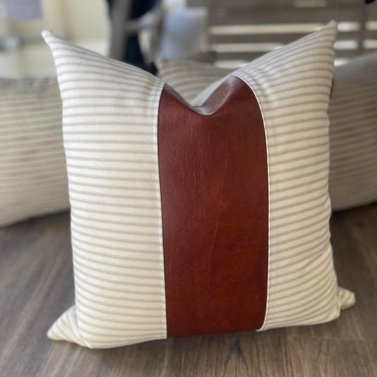 Striped Canvas + Faux Leather Pillow with Down Feather Insert