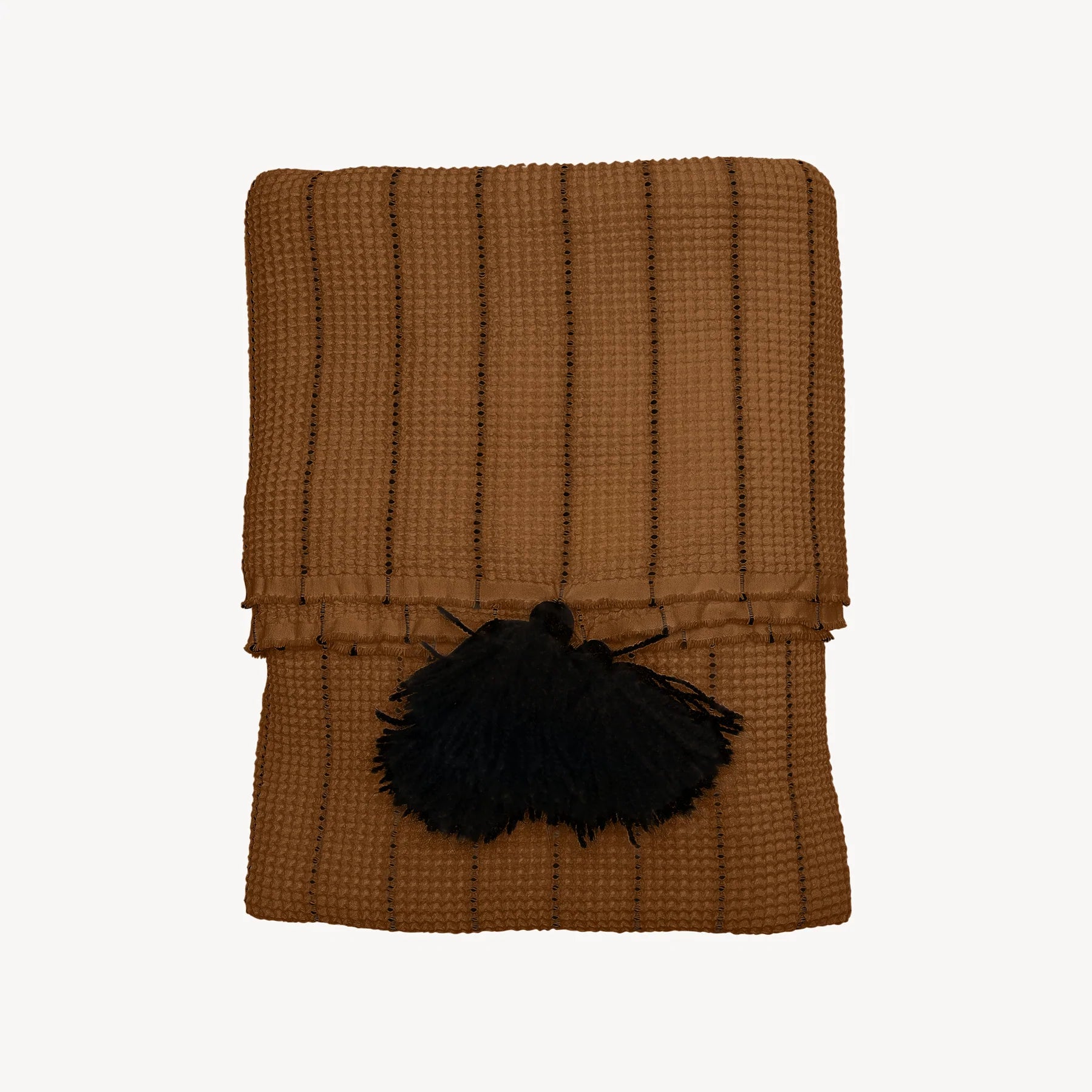 This thin-black-striped Turkish cotton throw blanket makes a beautiful accent piece and an ultra-cozy blanket for anywhere. Anytime. Any day. The Turkish artisans have added handmade pom-poms that enhances a soft boho vibe, while the lined stitching is elegant and understated.