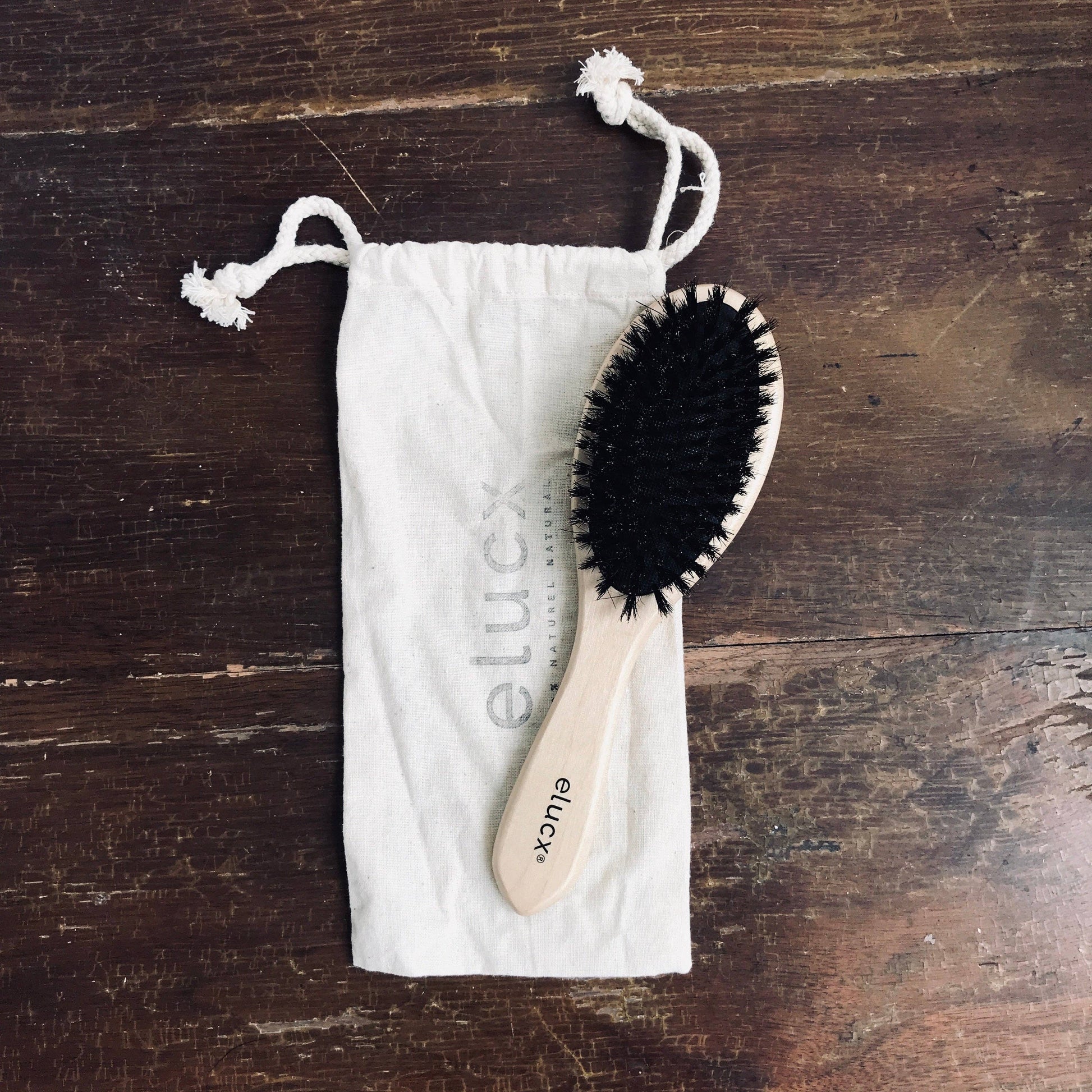 - Elucx boar bristle brush comes with its carrying cotton bag.