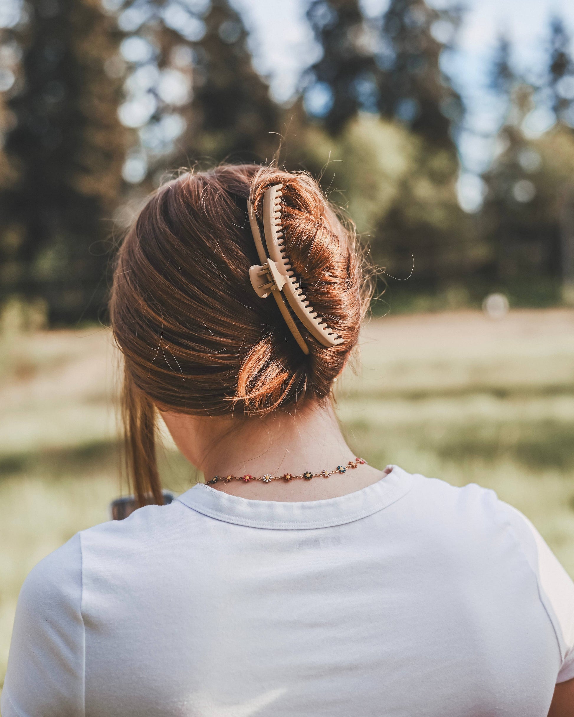 - Small - 2 ¾ inches long -Works best for those with short to medium length hair, with thin to medium thickness if you are wanting all of your hair up & secure. The small also performs extremely well for half-up half-down styles & for clipping buns for those with thicker & longer hair.