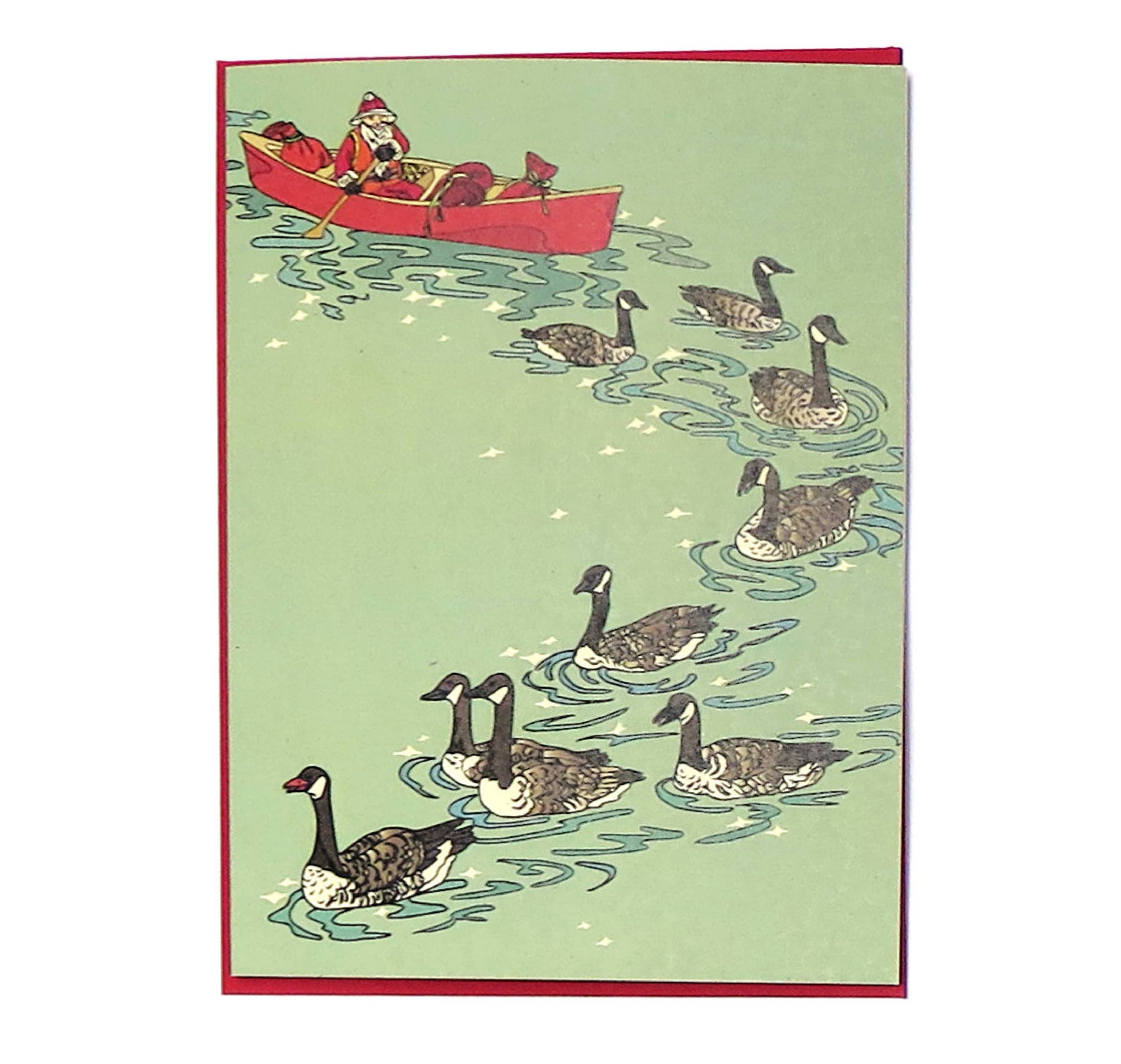 A very northern and nature loving Santa on a magical canoe trip with a flock of geese leading the way.
