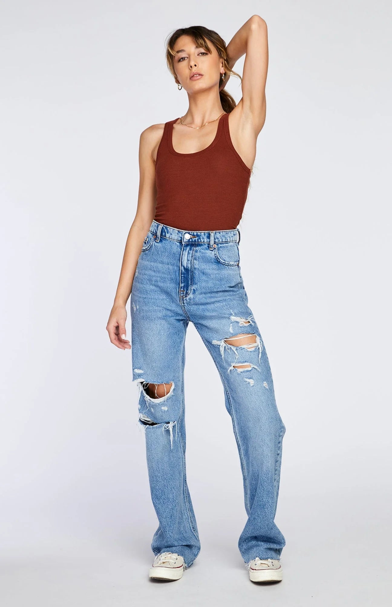 The Corbin is a fitted tank with a scoop neckline and racerback. Made of a stretchy ribbed fabric, it's an essential layering piece.