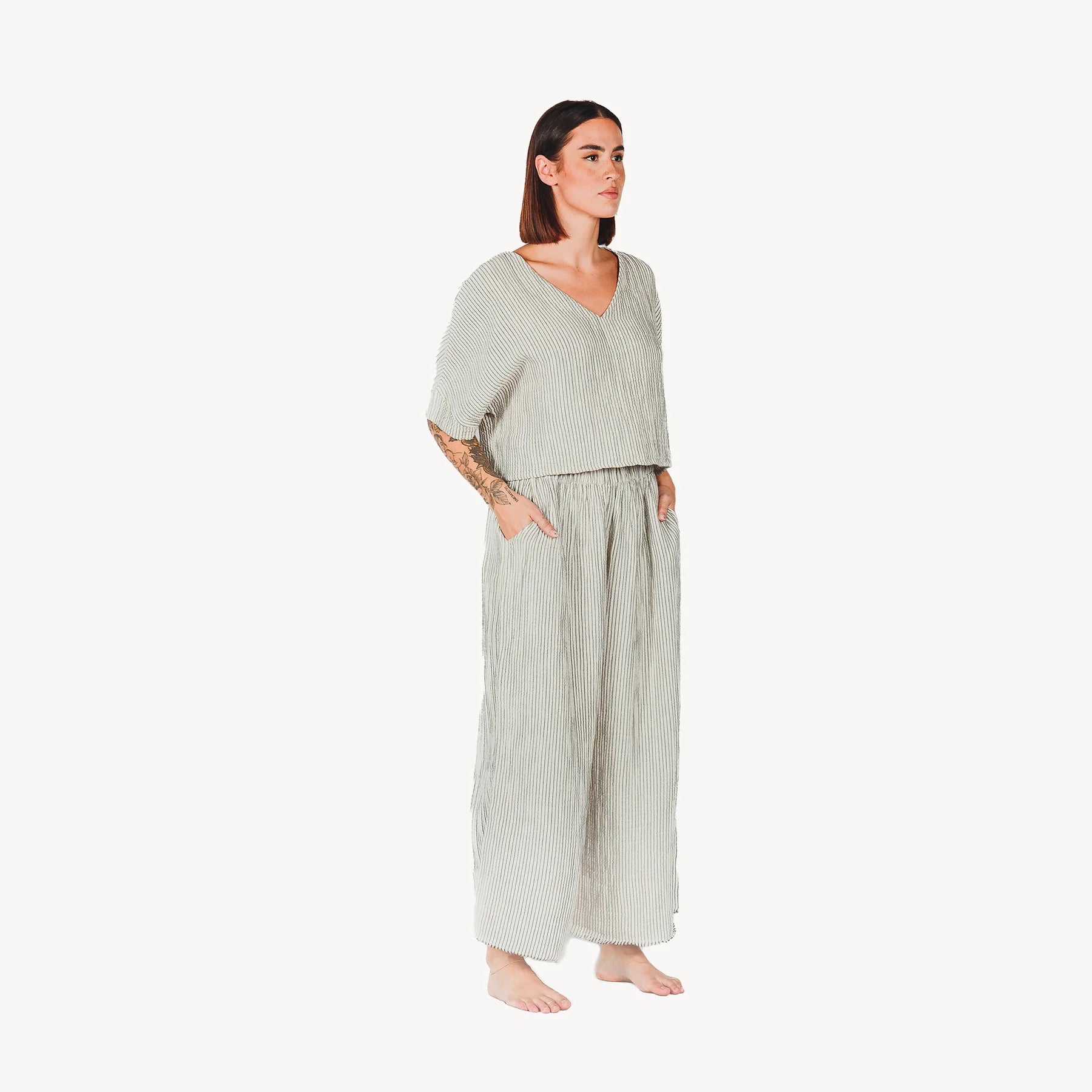 The Striped Crinkle Cotton Apparel is designed to comfortably fit most bodies sized S, M, and L, though it can be comfortable on smaller and larger bodies outside of this size range. Note that sizing may slightly vary through the sustainable garment-dyeing process.Care: