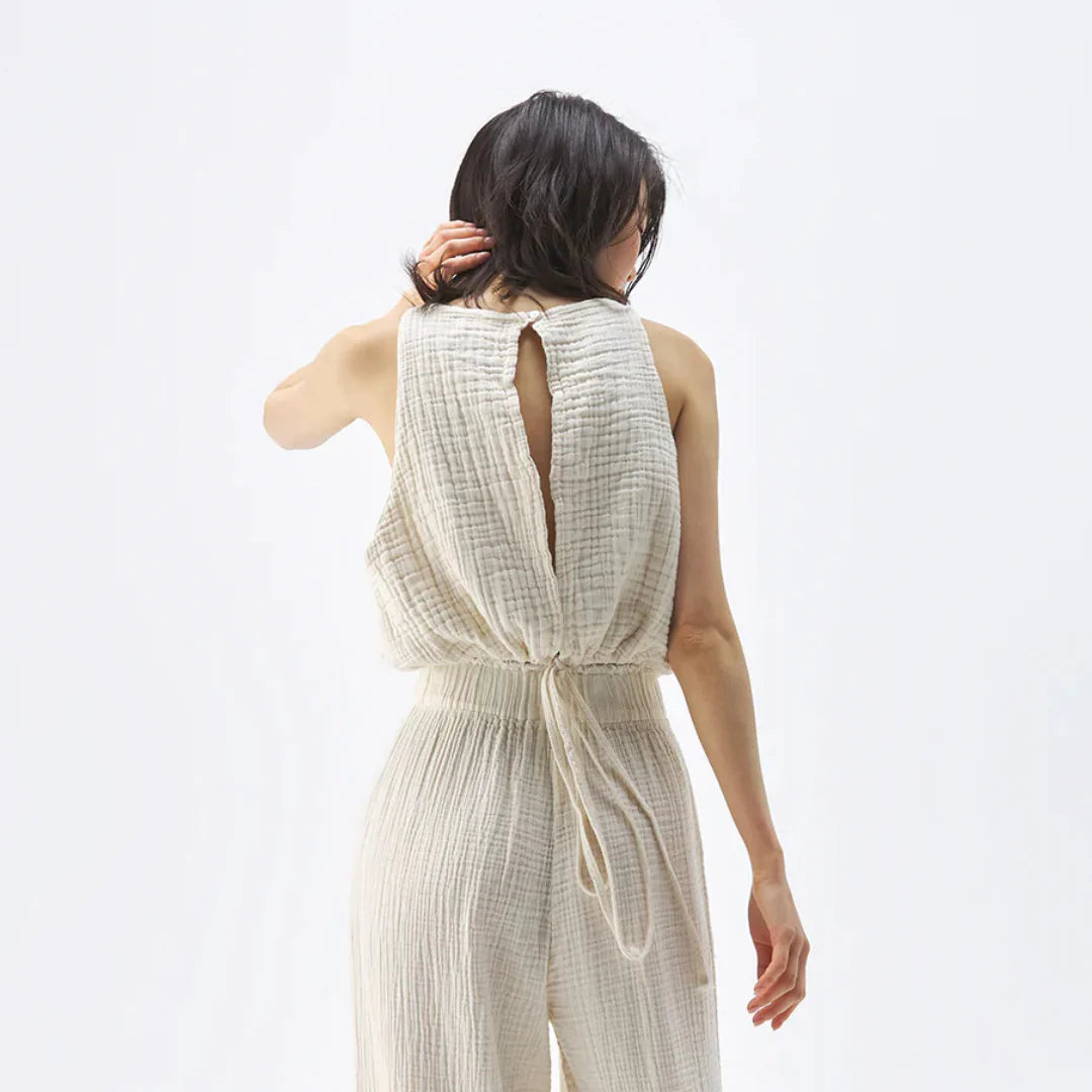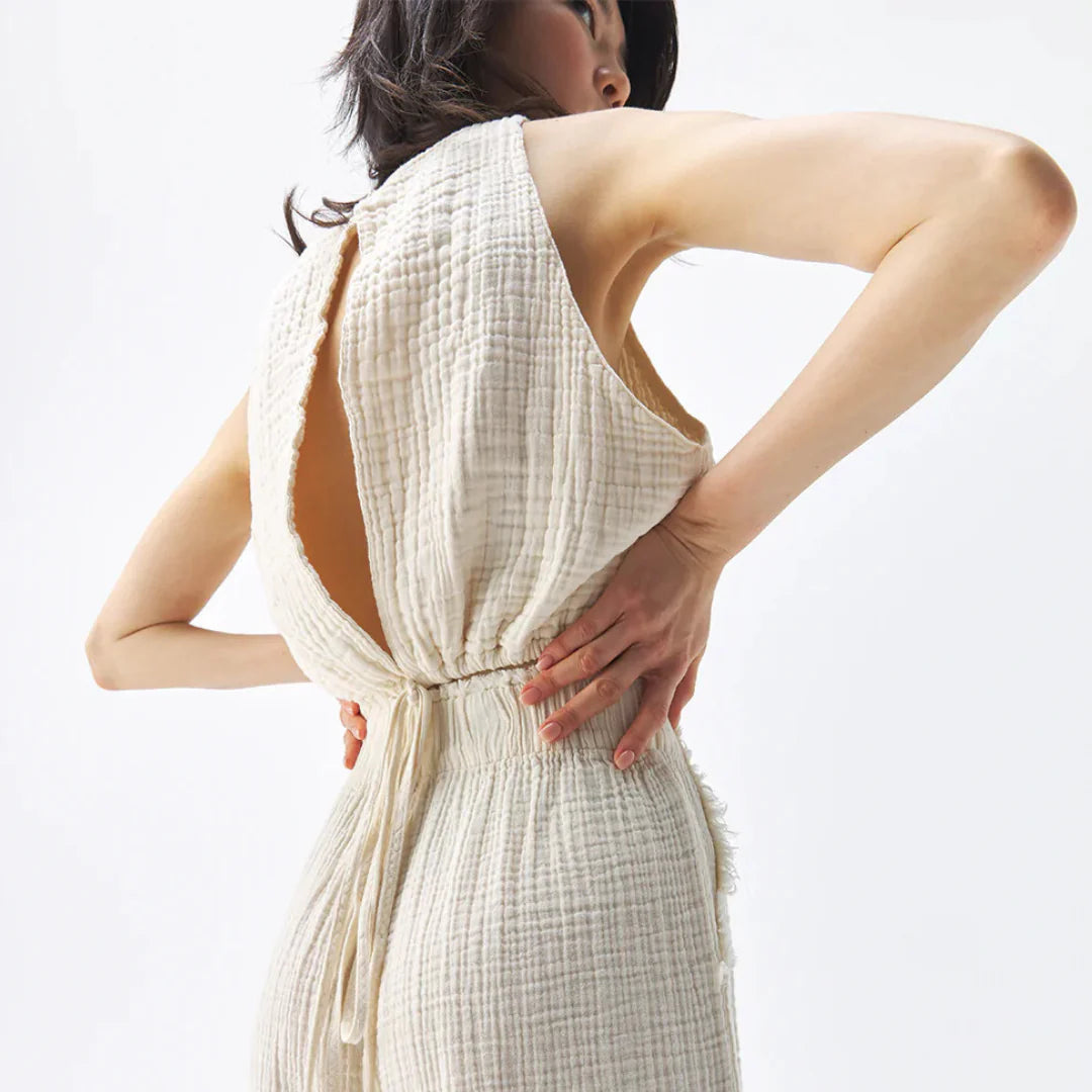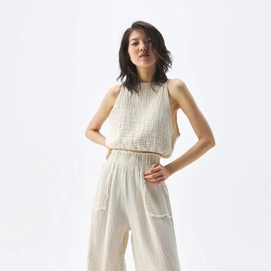 Made with a luxe fabric composed of doubled Turkish muslin cotton. The crinkle muslin texture is incredibly soft on the skin, and feels lightweight, yet substantial when worn. Designed in an oversized style, the Keyhole Tank Top has a draped keyhole cut on the back, a flowy fit at the front with a soft, high waist draw string detailing.
