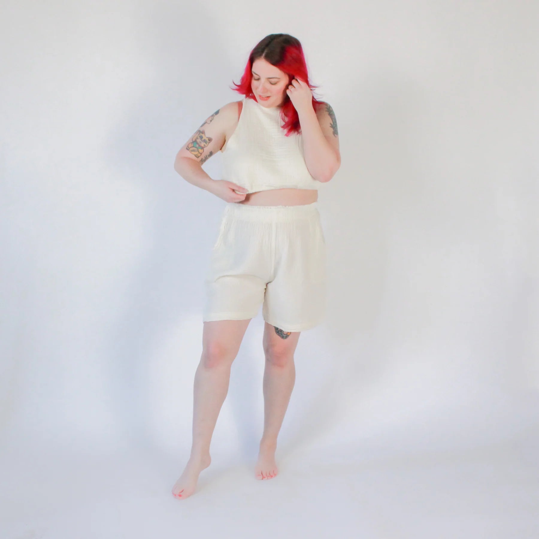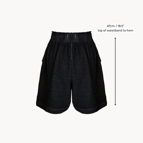 Your go-to summer short, or for travel adventures ahead warm. All day comfort with a wide leg and soft, stretchy waist band with a flowy, free-feeling crinkled cotton.