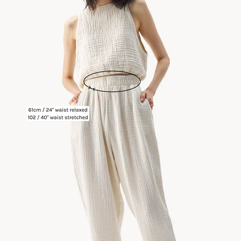 Keep it chic from the beach to the dinner date. All day comfort with a wide leg, tapered at the ankle, and soft, stretchy waist band with a flowy, free-feeling crinkled cotton.