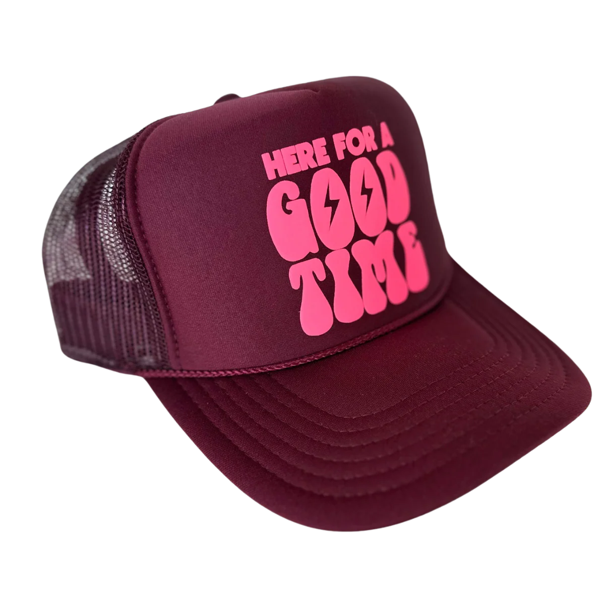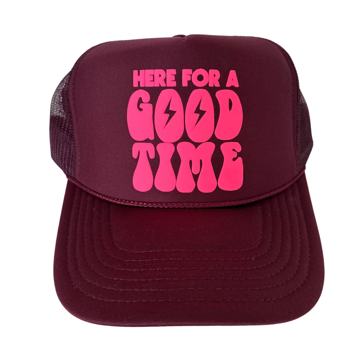 Here for a Good Time Trucker Hat - Maroon + Neon Pink