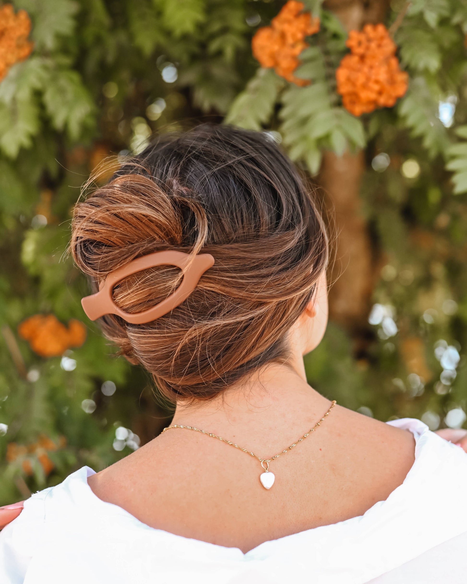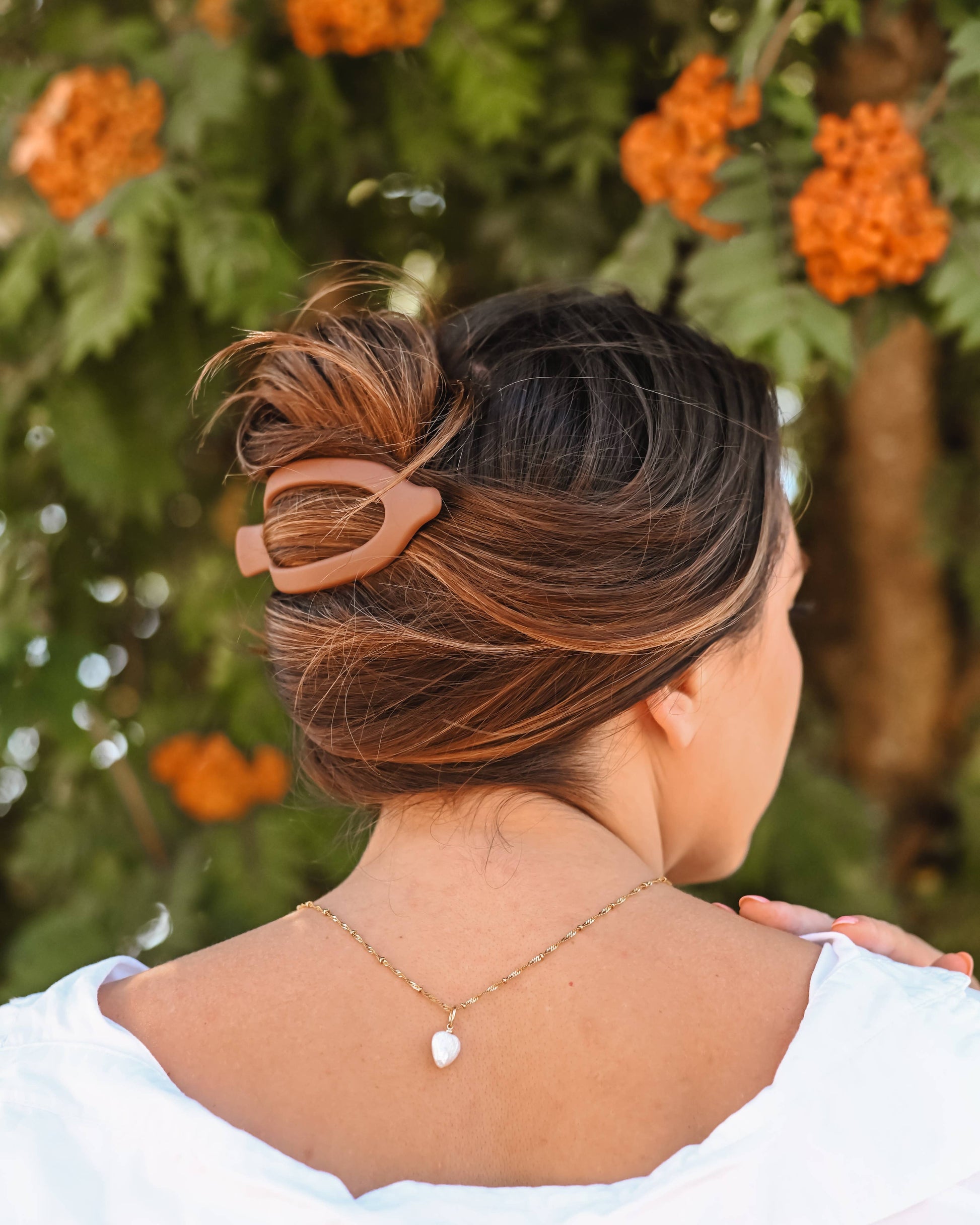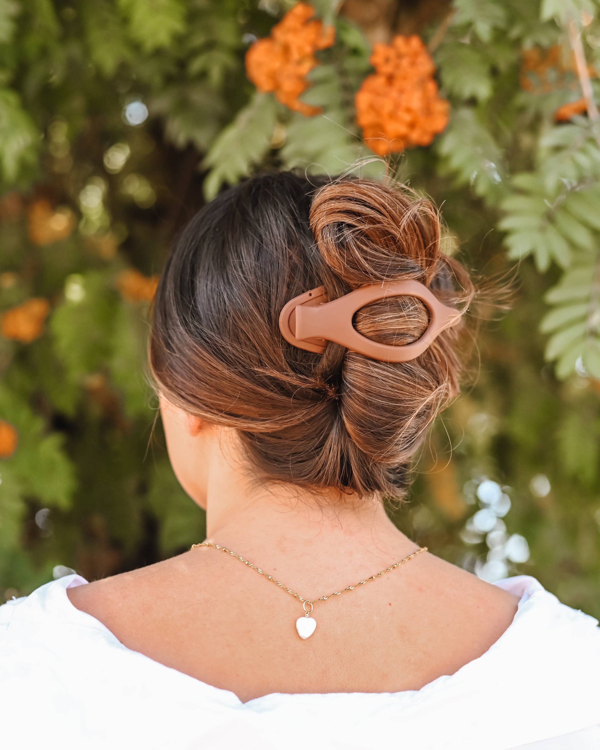 The Lay Flat Wide Clip is a fantastic clip for those seeking comfort, style and efficiency. This clip is best for driving, laying down and just overall relaxing due to its flat-laying nature. Say goodbye to your clip’s teeth digging into your head! Despite this clip’s purpose being for laying flat, the Lay Flat Wide Clip will also perform very well for day-to-day activities for the range of thin to thick hair. For those with ultra long or ultra thick hair, this clip will look and perform wonderfully with a half-up half-down hairstyle. This Hershey's Brown Lay Flat Wide Clip is a rich brown with a warm undertone, a matte finish and monochrome engraved logo on the inside. Length: 4 inches long