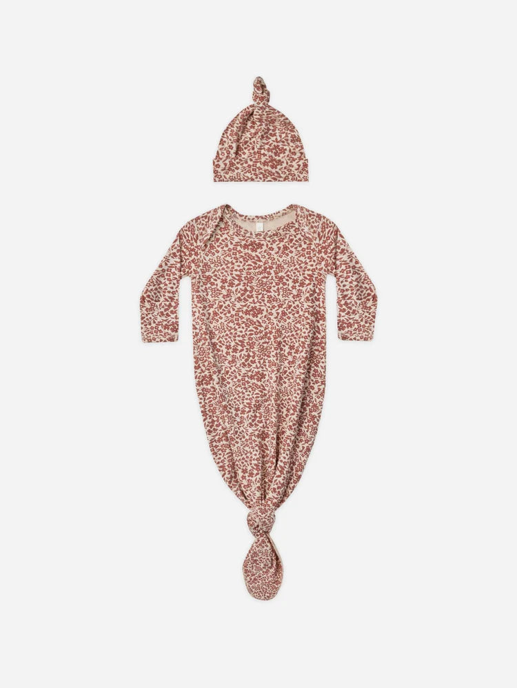 Knotted baby gown paired with a knotted baby hat in a stretchy rib knit with foldover hand mitts.