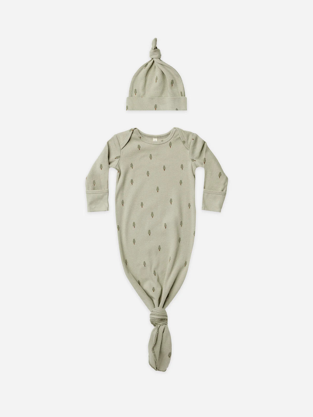 Knotted baby gown paired with our knotted baby hat in our stretchy rib knit with foldover hand mitts.