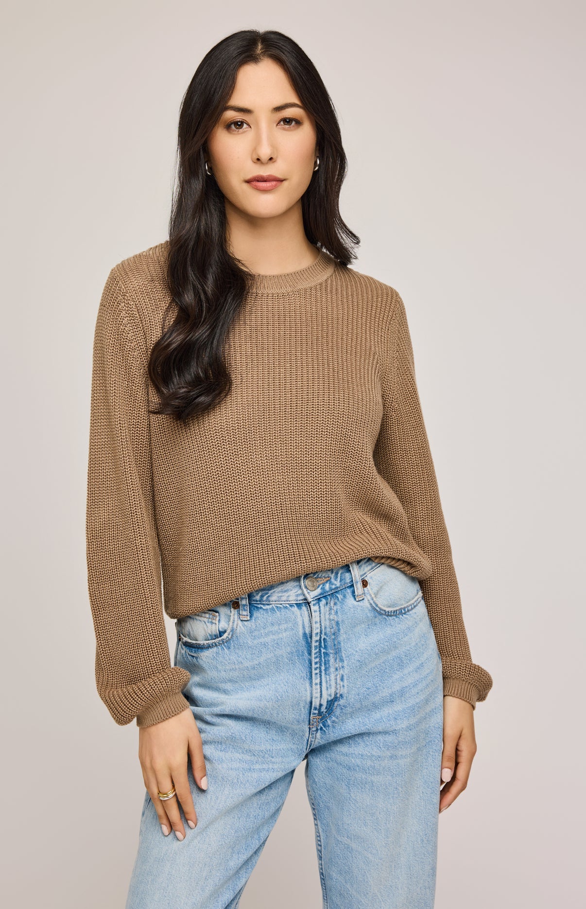 The Maxine sweater is made of a soft yarn in a half cardigan stitch. Features include a crew neckline and back cut-out detail.