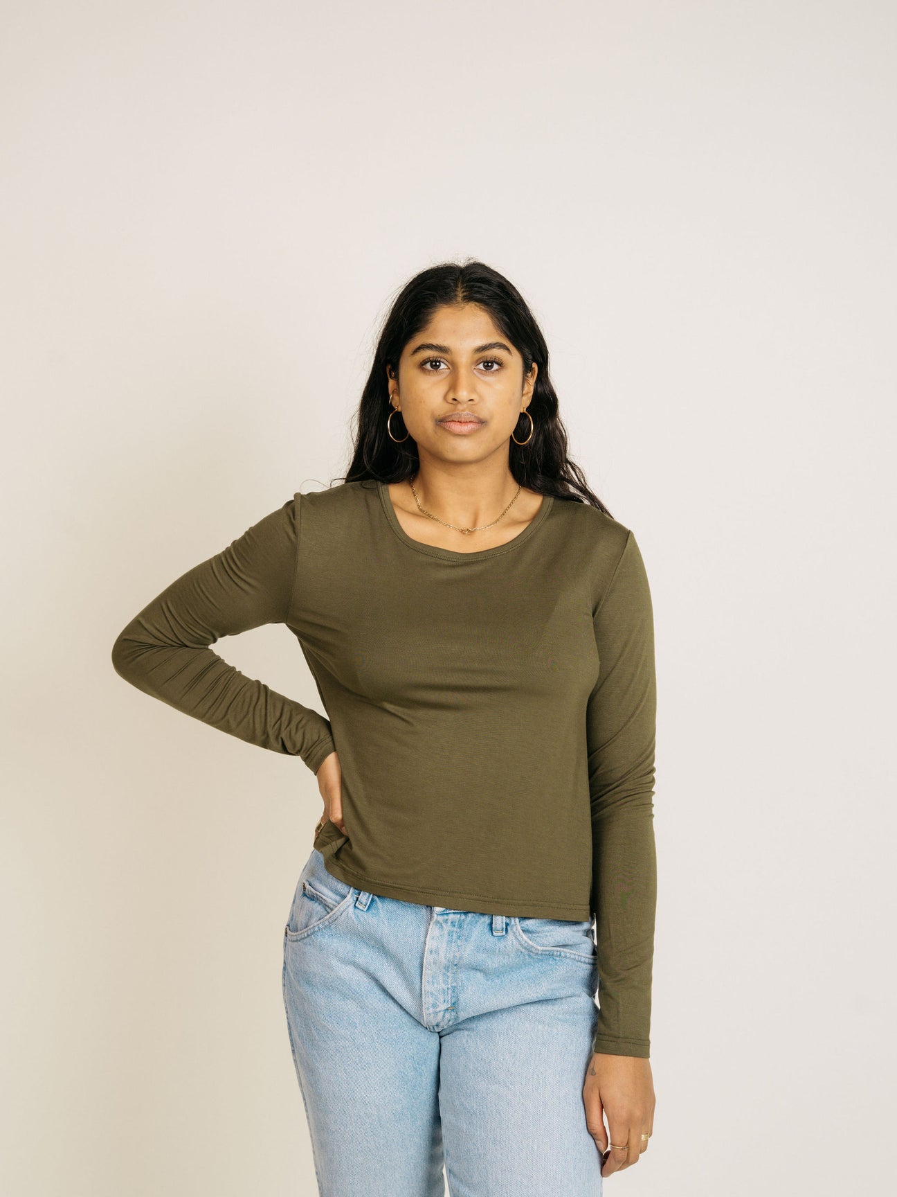 This long sleeve tee is luxe! We've updated the fabric for an even dreamier feel. It's silky texture drapes the body beautifully. It’s your everyday long sleeve with a more sophisticated feel.