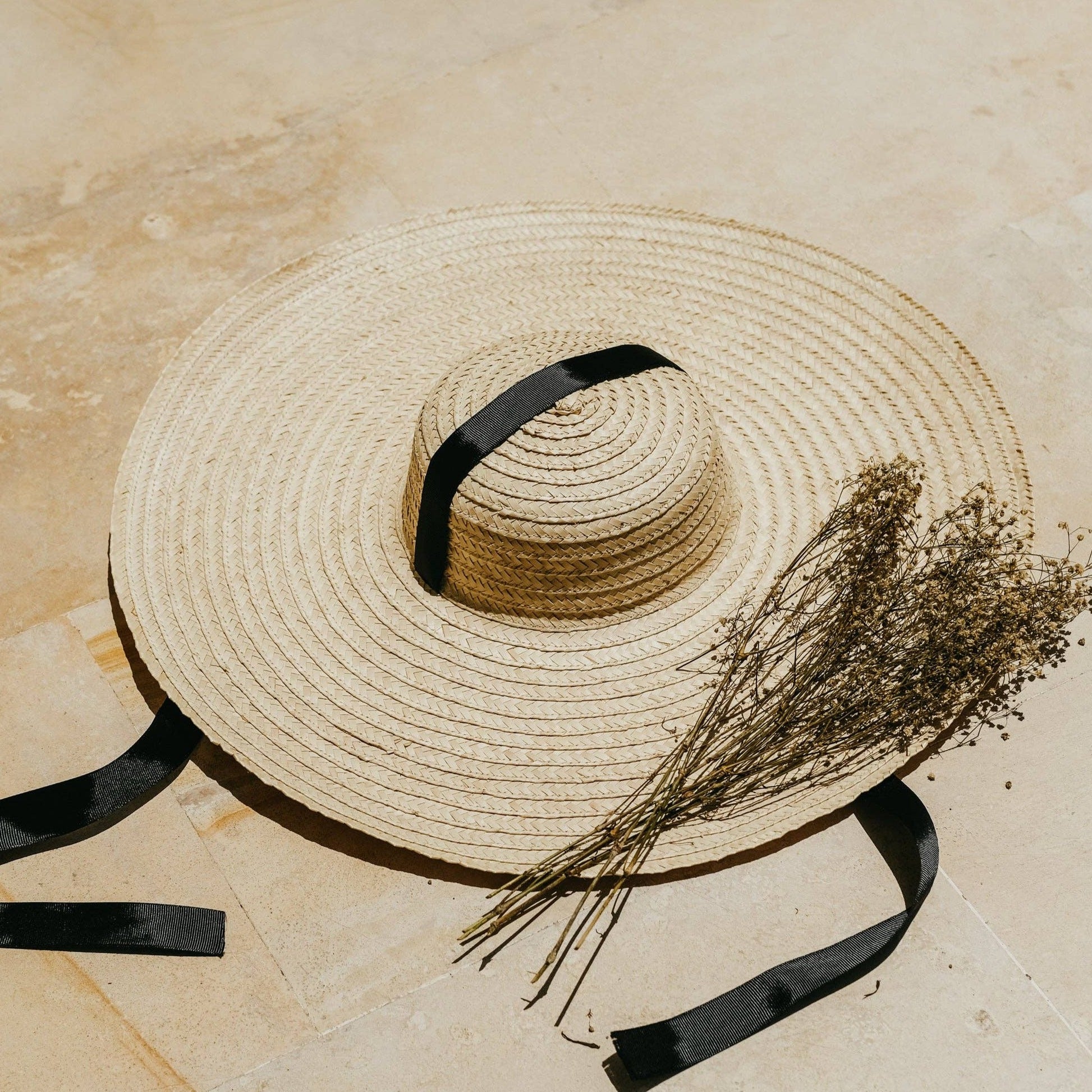 This hand woven oversized straw hat features a wide brim with a ribbon that ties under the chin. This intricate hat gives the wearer protection from the sun while also giving them a stylish appearance. It pairs great with any outfit, especially dresses. Perfect for a day at the beach.