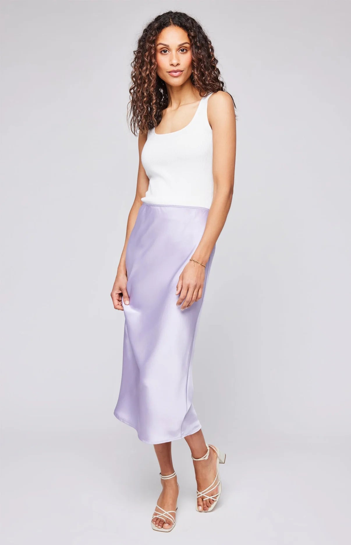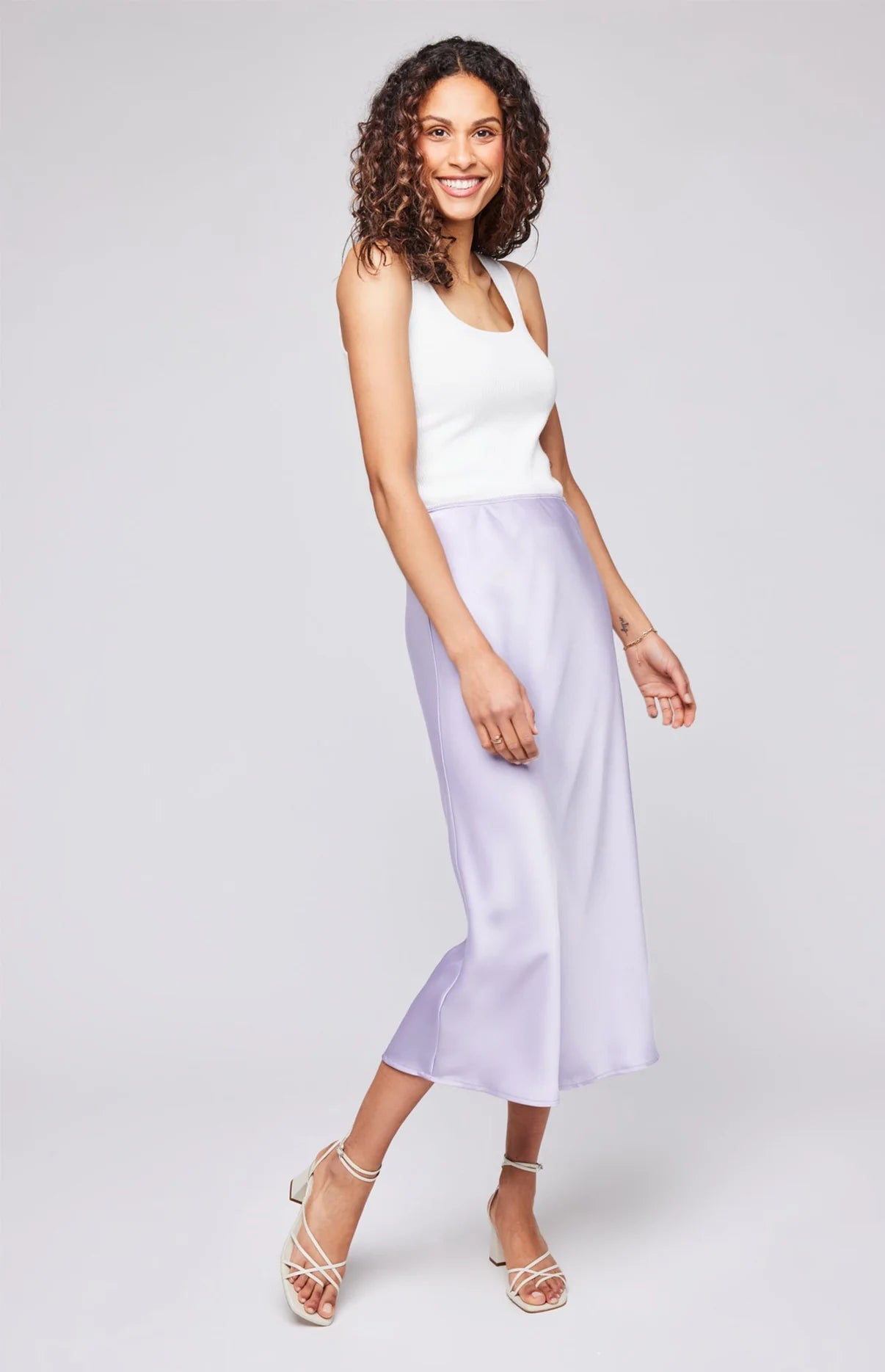 The Selena skirt is made of a bias cut satin fabric for a flattering fit. Features include an elastic waistband with a delicate scallop trim along the edge