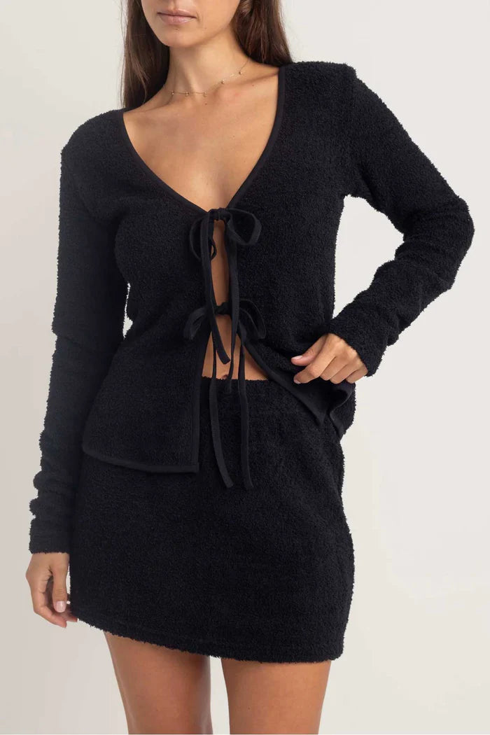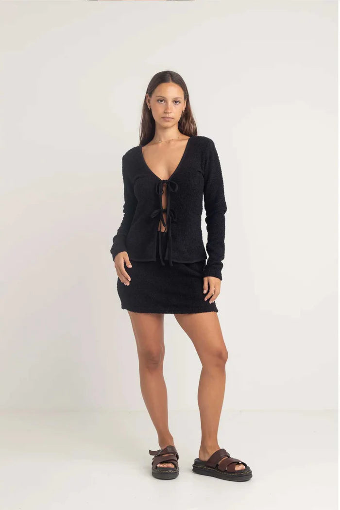 The Sofia Boucle Tie Front Top features mid-weight knit with an open front, tie detail, and contrast edges for laid-back coastal style.