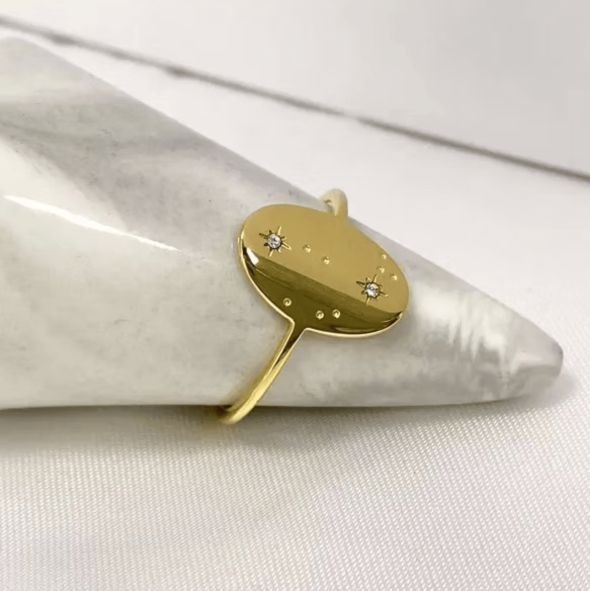 When we say: PERFECT. We mean it. This minimalist oval-style ring is golden perfection. The significance of two stars in full alignment is a token reminder that balance is incredibly crucial to your well-being. Take the good with the bad, the ebb and the flows and never hold onto too much.