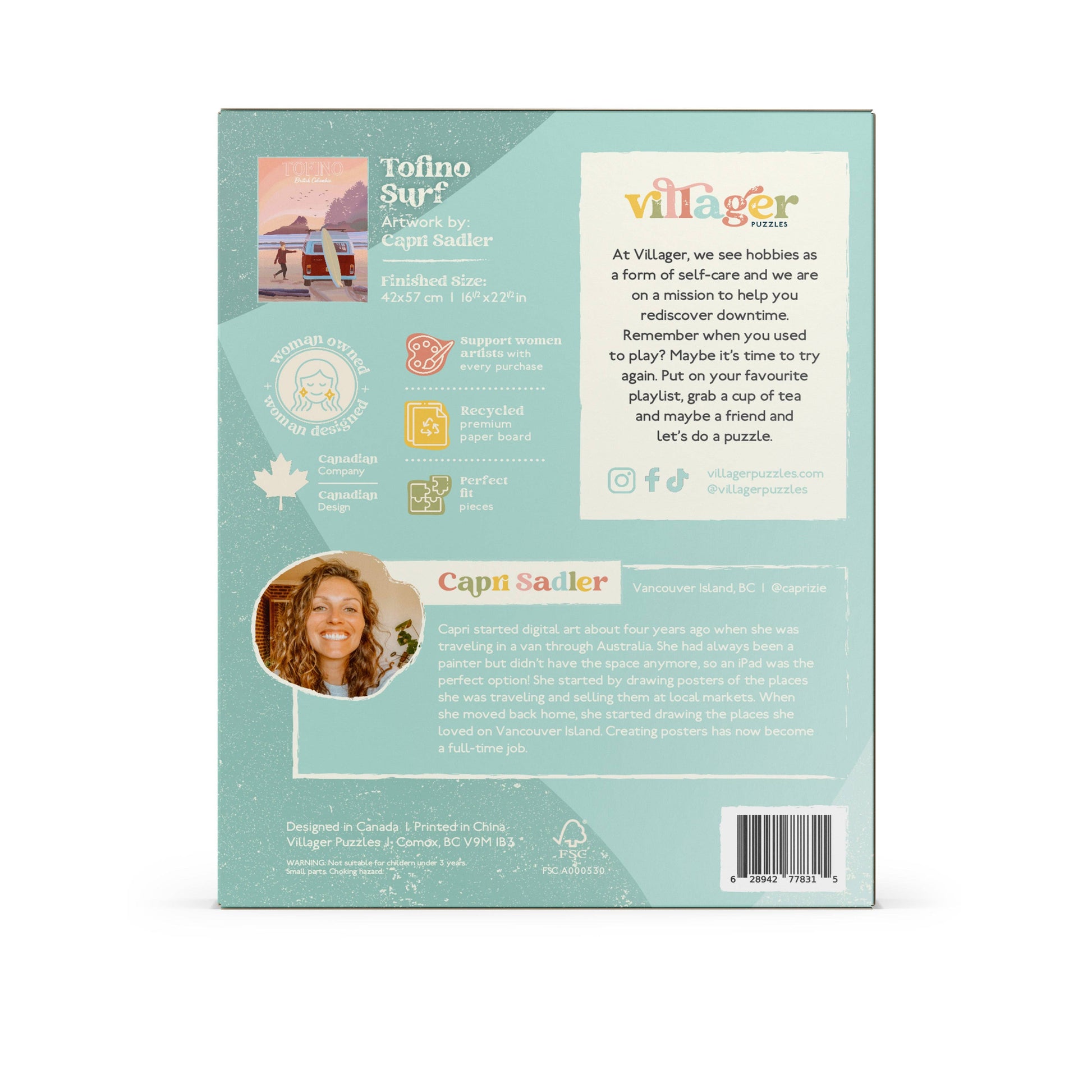 Surf's up, puzzle on. Here's your ticket to the laid-back vibes of Tofino's surf culture. Feel the coastal breeze and take a break from the daily grind as you piece it all together. Beautifully-illustrated travel poster puzzle of the Tofino's gorgeous sunset. Designed by Vancouver Island artist, surfer & beach lover, Capri Sadler. Great gift idea or souvenir for beach lovers or vacationers to Vancouver Island.
