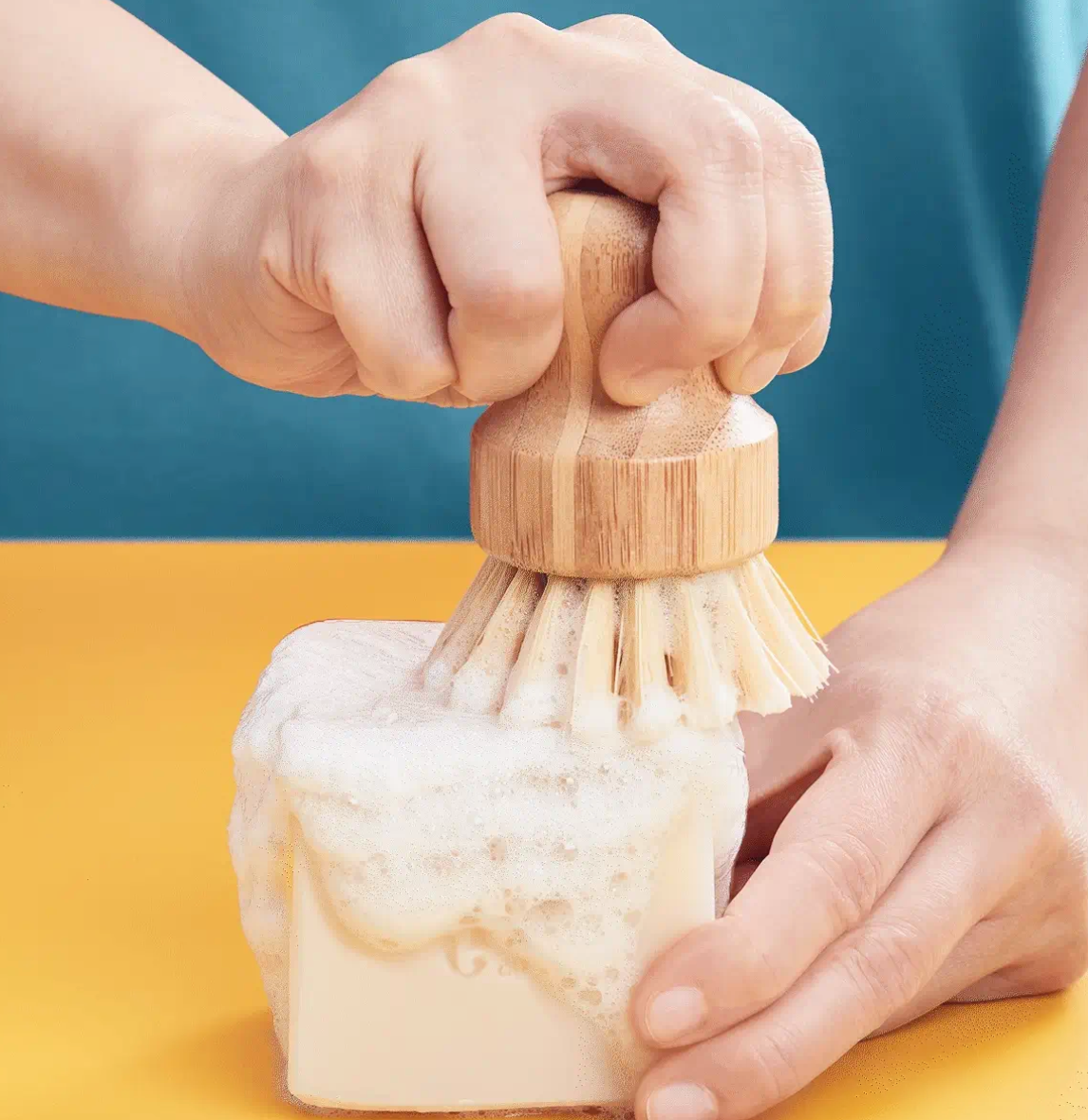 Create suds by rubbing the Solid Dish Soap with a brush or loofah. We recommend our Scrubber Brush, Dish Brush, Loofah or Sponge Cloth.