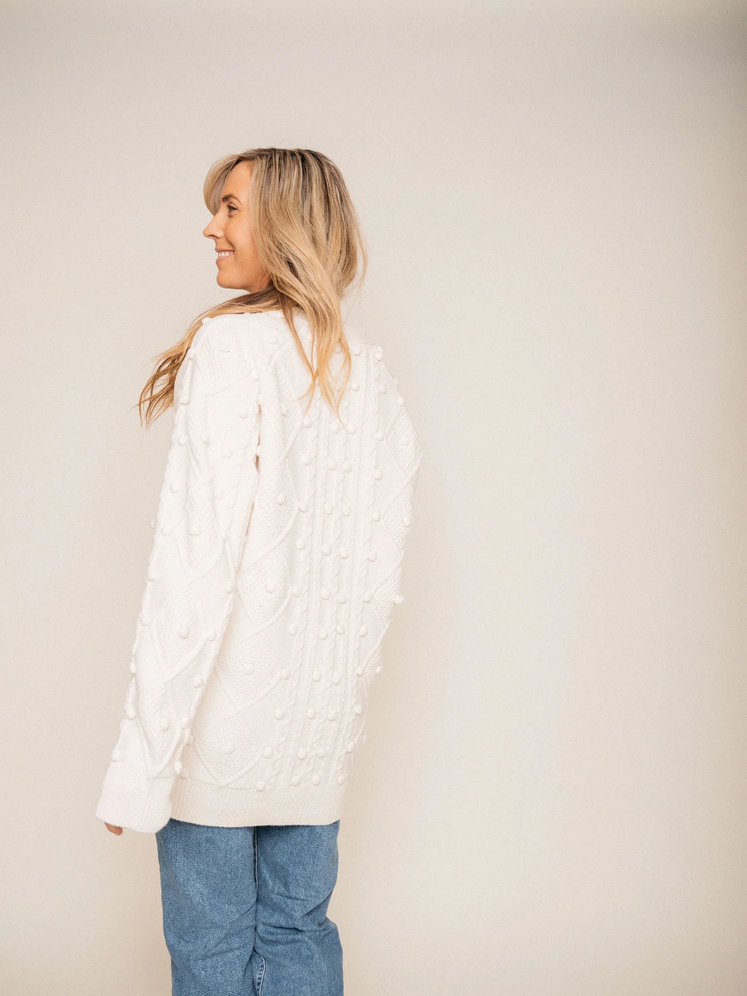 There are so many sweet details on this sweater we don't know where to begin. The fisherman-inspired cable knit is dressed up with the addition of pom-poms to add that sweet feminine touch. This oversized, slouchy cardigan has a deep V-neck, a 5-button enclosure, and two front pockets. It can be worn on its own or over your favourite outfit for a cozy, layered, warm look. This is one is not to miss